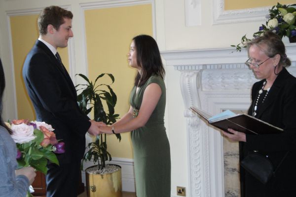 牧师证婚。 新郎新娘说:“Yes,I do”!