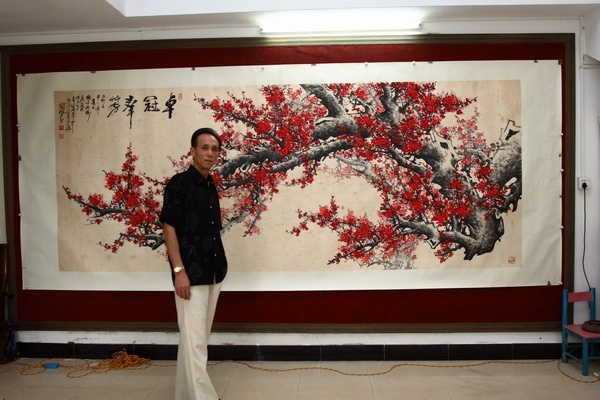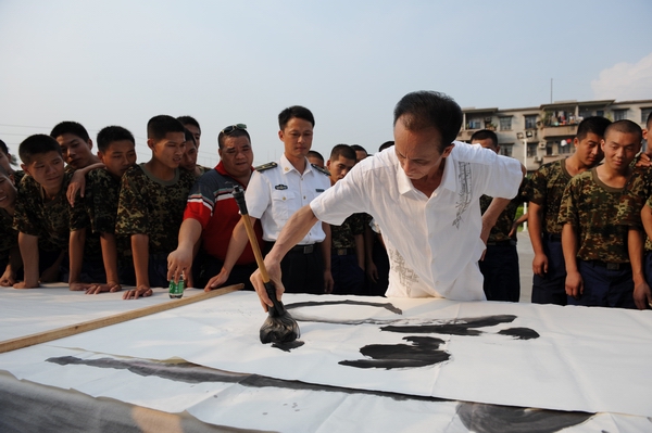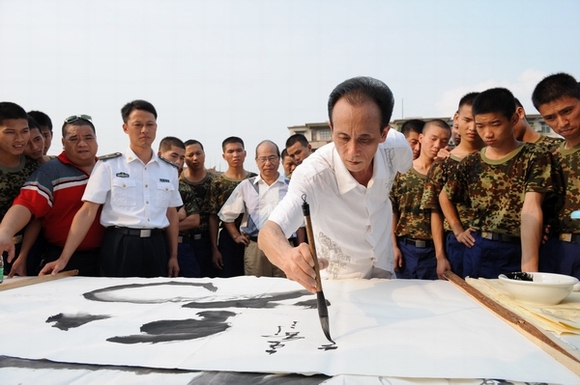 陈飞雄师傅确实了不起,那天他在石花山西严寺<<武德书道利人天,观心印照振坤>>横幅下泼墨书赠寺院,竞然引来中史电视台\广东电视台\南方卫视\江门电视台\台山电视台\羊城晚报等多家媒体记者现场架起长枪短炮采访,为我们台山人争光.陈师傅你真棒