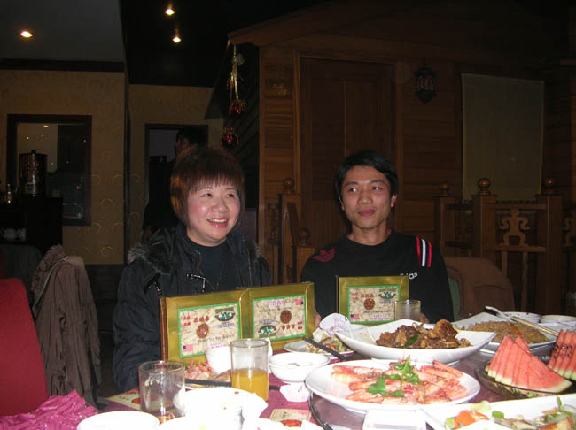 台山同学网里首位台山网友办婚宴,在福临门酒楼大排筵席四十围,亲戚朋友、工友、网友共同见证新人喜结连理(邀请近五十位网友参加),婚礼隆而重之,参加的亲朋举杯祝贺,享受丰盛的晚宴时还欣赏到台山同学会副会长陈炎宏和网友舞夜丽人的精彩演唱,晚宴中有别开生面的抽奖活动,四十多份奖品中有来自美国的朱古力糖和高级花旗参,大奖是三台700万像素的佳能数码相机。我们有7位网友成为幸运儿。